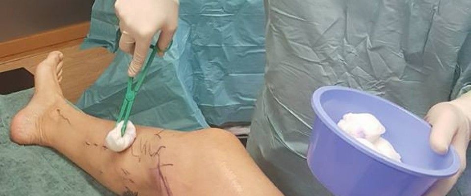 • Operationen kan utföras i lokalbedövning efter man sprutat rikligt med bedövningsvätska kring hela kärlet.